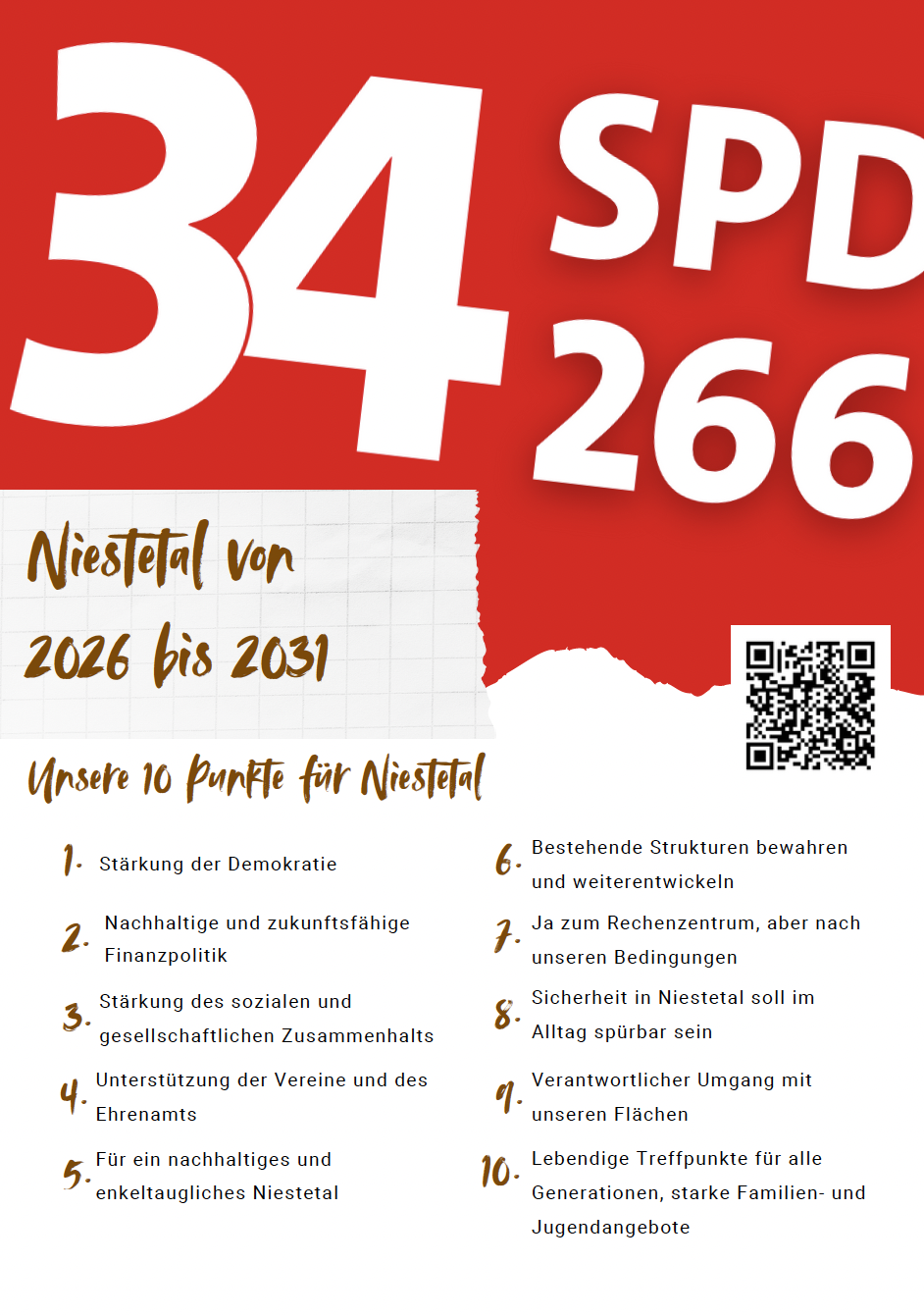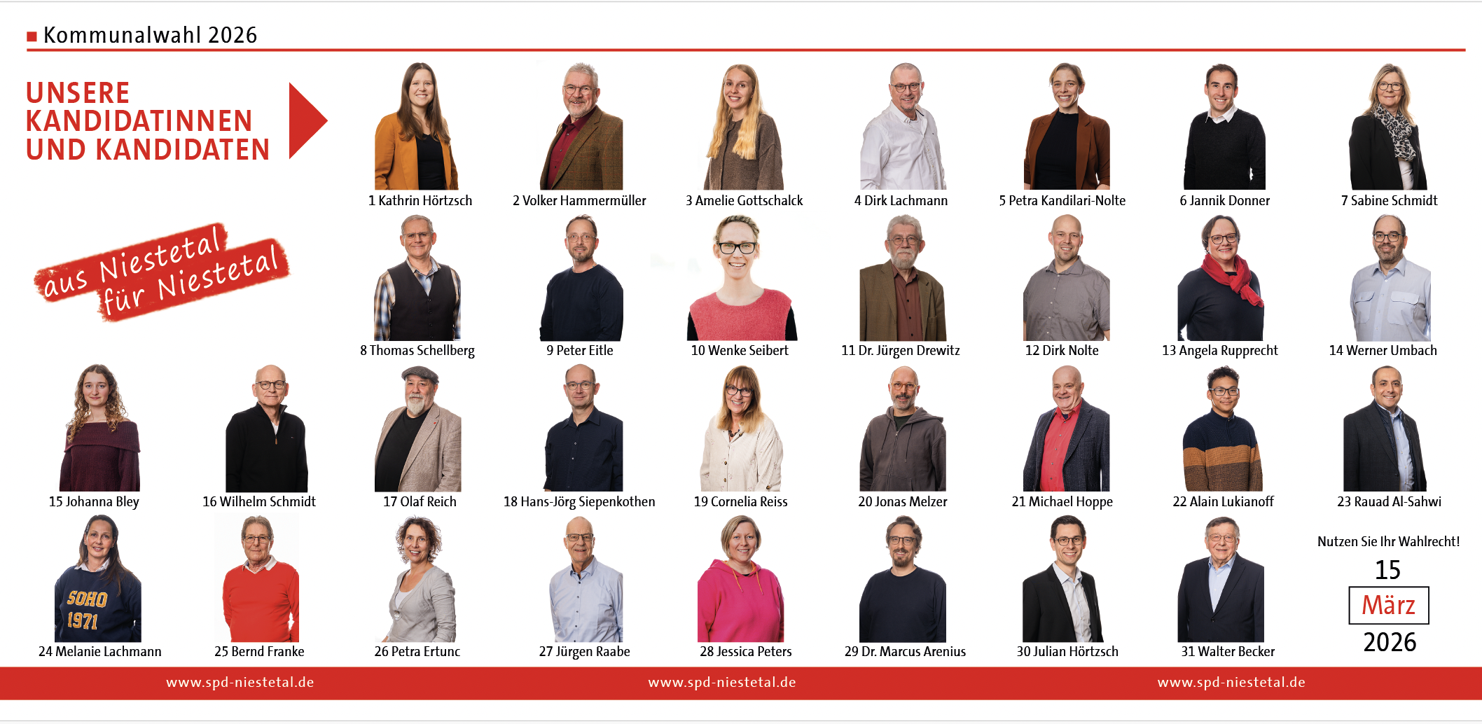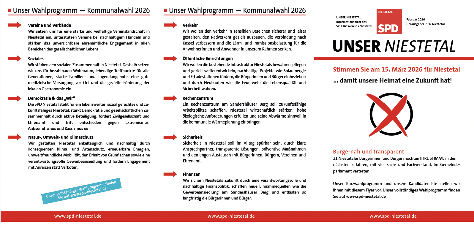 Medien Wahlkampf 2026 Unsere Videos VIDEO 1 VIDEO 2 VIDEO 3 Unsere Comicreihe - Auf Nachfrage unser Fazit zum W.i.N Flyer Wahlkampf 2021 Unser Wahlaufruf Unser Wahlprogramm Unsere Ansprechpartner*innen Niestetal digital SPD bürgernah Lärmschutz in Niestetal Niestetals Finanzen Gewerbeansiedlung & Sandershäuser Berg Naherholung in Niestetal stärken Verkehrsentwicklung in Niestetal Klima- und Naturschutz für Niestetal Wohnraum und Bauen in Niestetal Stärkung unserer Vereine und Verbände Sicherheit und Ordnung Jugend, Senioren und Familie Unsere Spitzenkandidatin Kathrin im Gespräch mit Timon Gremmels, MdB Sieh dir diesen Beitrag auf Instagram an Ein Beitrag geteilt von Timon Gremmels (@gremmels)